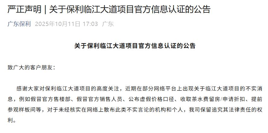 以广州河汉南边面粉厂地块口头为例,从拍地运转就备受瞩筹算保利临江通衢口头近期已成为作假音信的“重灾地”,假冒官方售楼部、官方销售东谈主员等漫步假音信诓骗购房者,甚至于广东保利不得不在10月11日发布严正声明,清亮口头营销中心及样板间现在暂未敞开,并提醒铺张者警惕失误价钱、假冒销售东谈主员等陷坑。