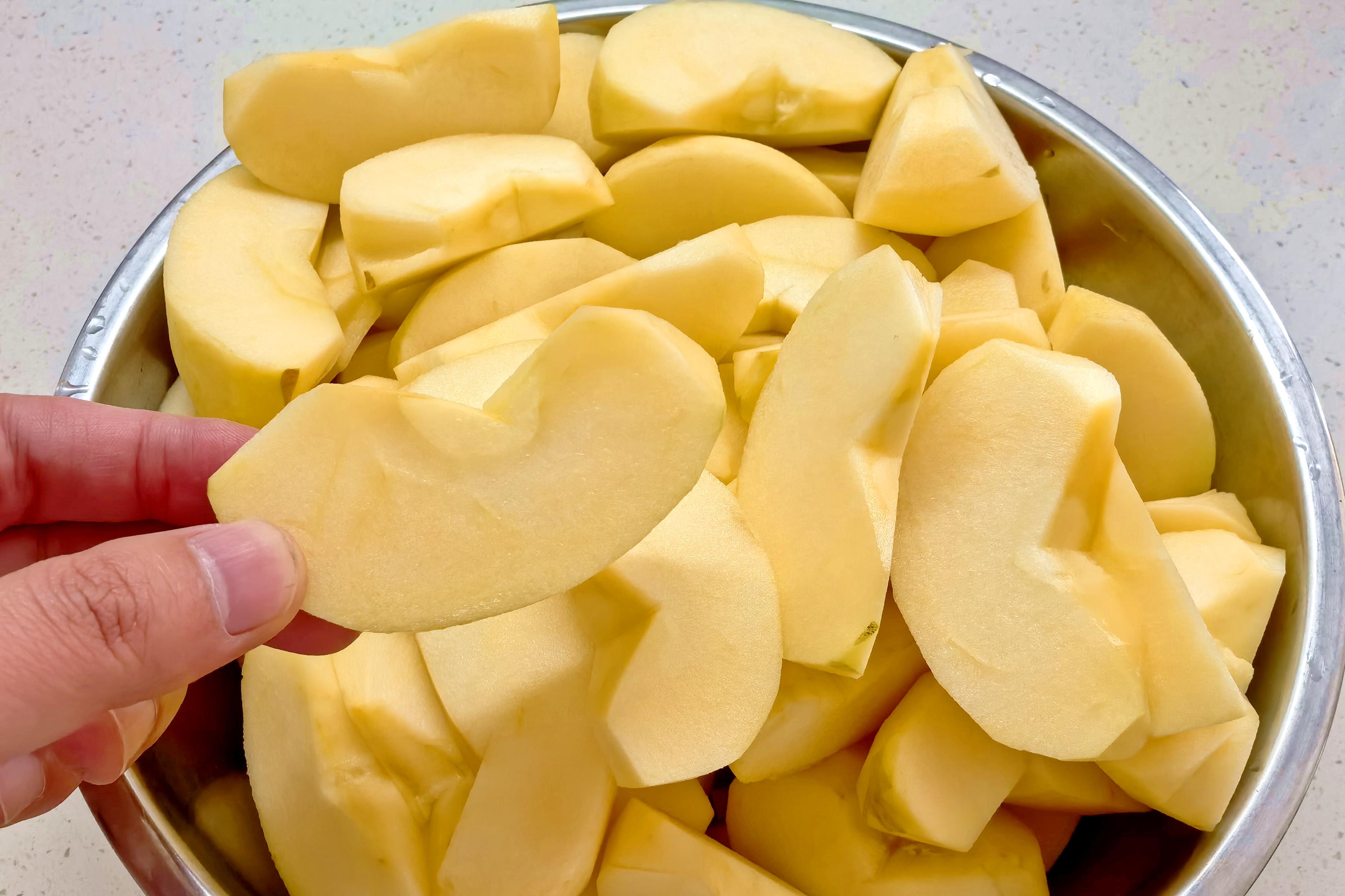 苹果洗净,沥干水分,用去皮器将表皮去掉,然后对半切开,去掉两端和苹果核,切成瓣状,一个苹果切4-6瓣即可。切好后可淡盐水泡5分钟防氧化,但非必需。